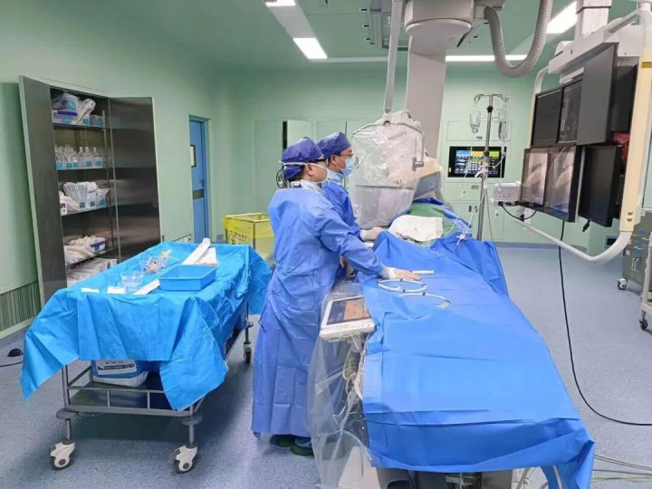 手术台上,主刀医师在患者腕部进行精准穿刺,导丝如“生命探针”般沿血管悄然抵达心脏。随着造影剂的释放冠状动脉的一段严重狭窄清晰显现。随即,指引导丝穿越病变,球囊精准扩张,瞬间撑开生命通道。一枚支架被植入病变处,牢固支撑血管壁。复查造影,血流恢复畅通。从穿刺到血管再通,关键步骤在十分钟内完成。这背后,是滨医附院24小时待命介入团队的“硬实力”。总院专家的高效协作与毫米级的操作精度,将区域协同救治的“最后一棒”化为决定性的胜利。