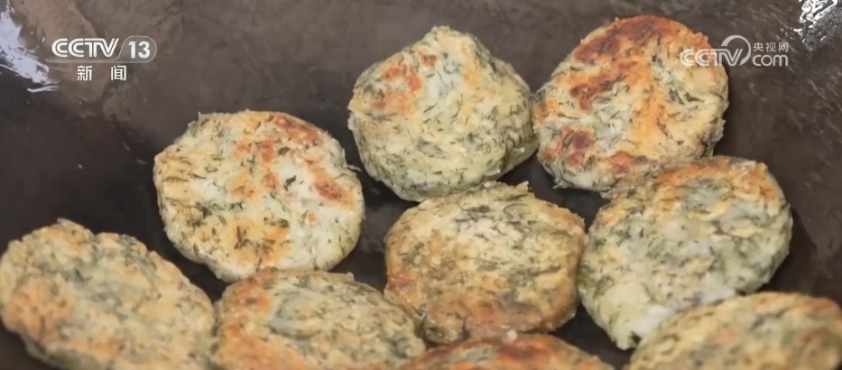 做蒿子粑,选料是第一步。早上新鲜采摘的蒿子清香扑鼻,清洗后焯一下水就能去除它的苦涩味。熬煮好的腊肉蒿子汤倒入糯米和籼米混合的米粉中,揉搓成小团再压扁。起锅烧油煎至双面酥黄,蒿子粑就做好了。在桐城市,蒿子粑还“走进”工厂,进行规模化生产,通过直播进行线上销售,深受消费者喜爱。